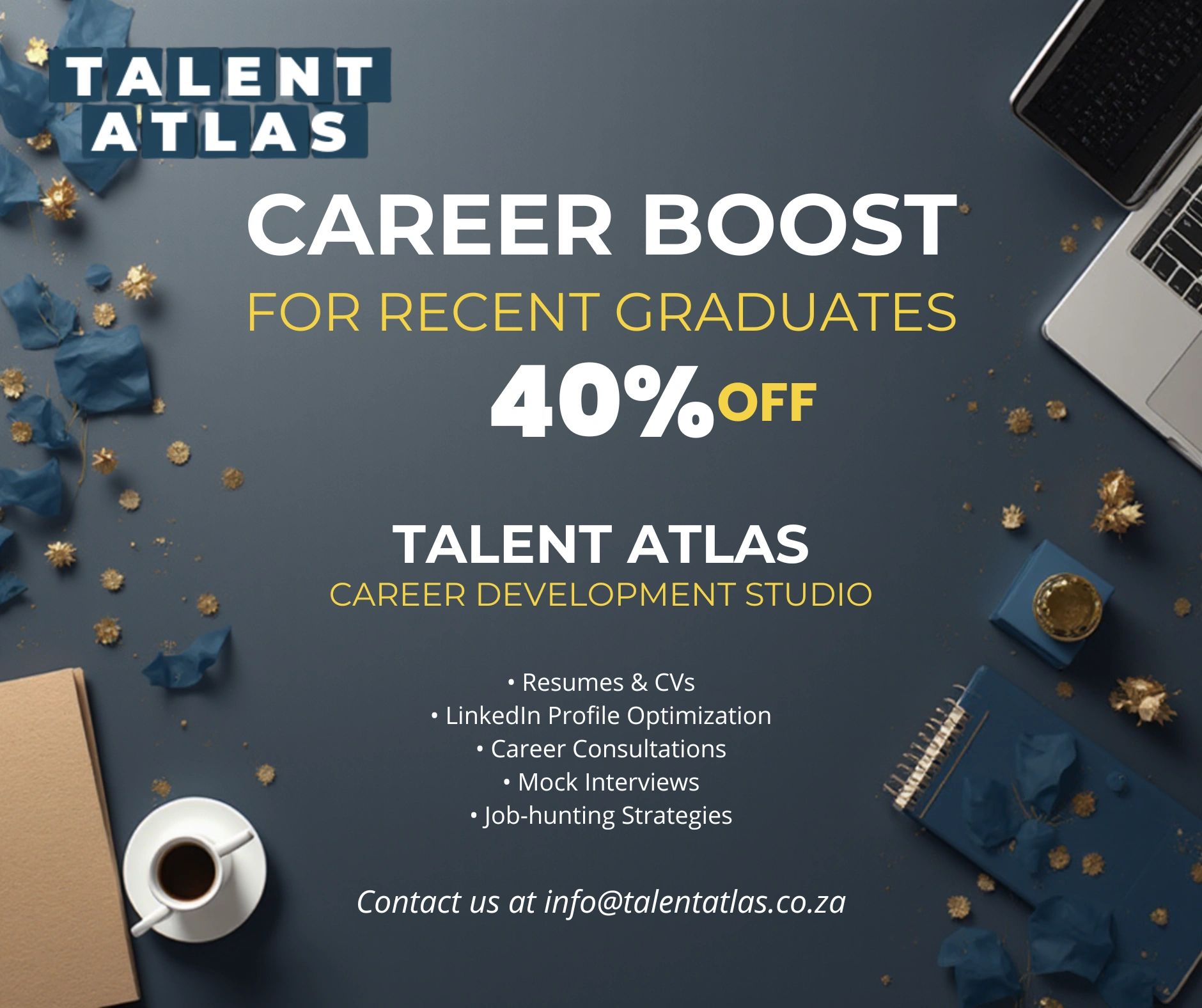 Career Development for professionals navigating change, growth, or new chapters. We can assist you with CVs and resumes (For both human and AI/ATS viewing), LinkedIn Optimization, Interview Coaching, Cover Letters, and developing your personal brand. We specialize in CV/Resume Writing in South Africa, South Korea, USA, and the UK.